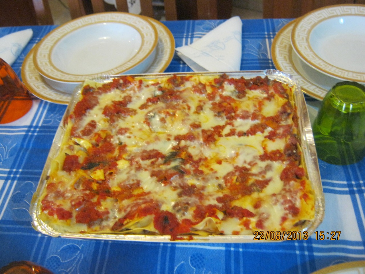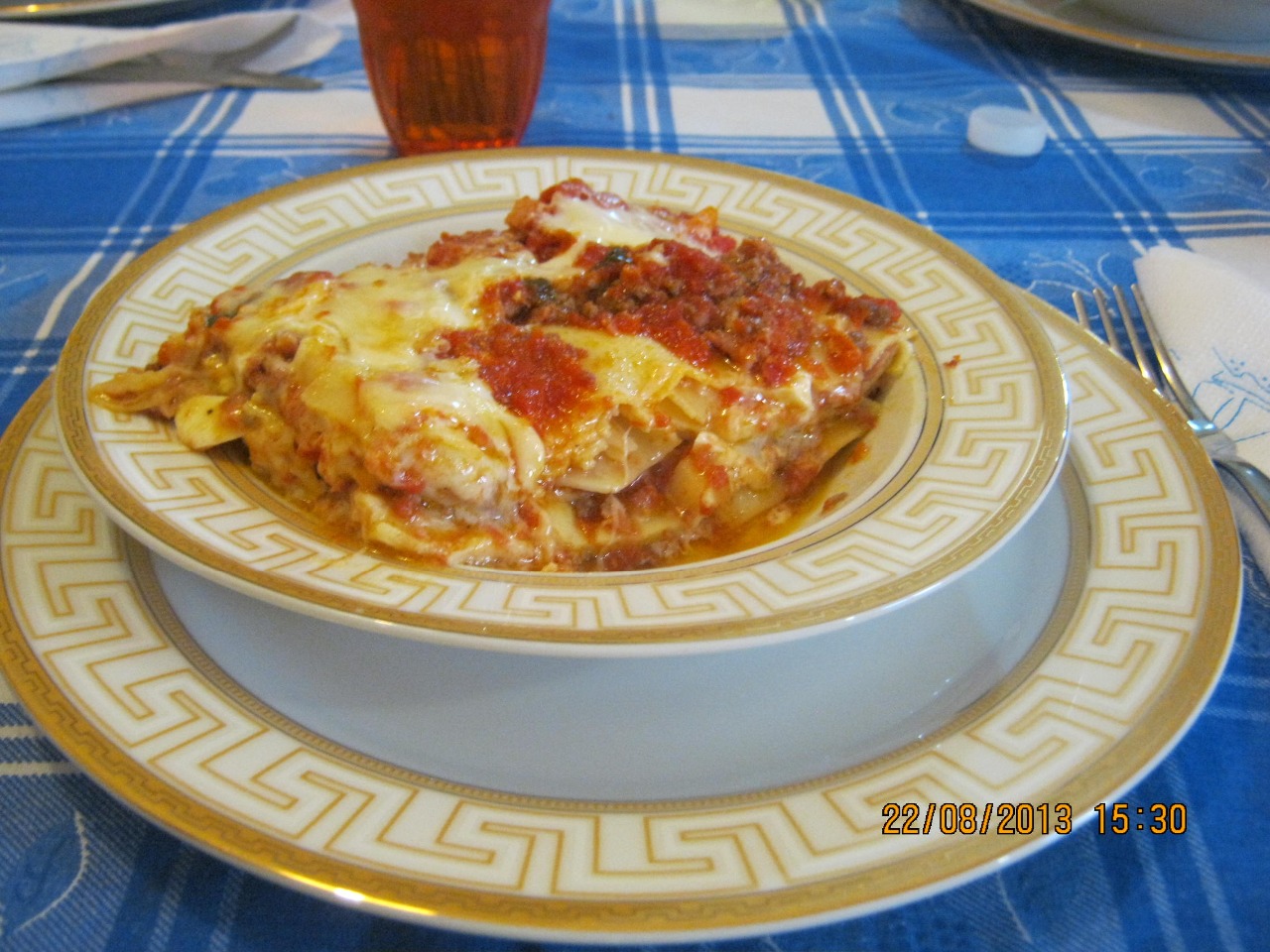 Procedimento: preparate un soffritto di verdure tagliate finemente a dadini (cipolla, sedano, carote) e aggiungete la carne macinata con un po’ di sale ed irrorate il tutto con il vino rosso. Fate cuocere per mezz’oretta a fuoco medio. Versate la passata di pomodoro (io uso quella fatta in casa perché non so nelle altre cosa ci mettono dentro..) e fate cuocere per un’altra mezz’oretta. Intanto fate cuocere in una pentola con acqua salata e due cucchiai d’olio extravergine d’oliva le lasagne (una sfoglia alla volta per un minuto circa). A parte preparate due o tre uova sode e in un’altra pentola i piselli con un po’ di cipolla e un cucchiaio di olio extra vergine di oliva. Prendete un teglia e versate uno strato di salsa di pomodoro, ricoprite con delle sfoglie di pasta scottate precedentemente per un minuto circa. Ricoprite il tutto con un altro strato di salsa di pomodoro, un po’ di prosciutto cotto e una spolverata di parmigiano grattugiato. Ripetete la stessa operazione:altro strato di pasta, di salsa di pomodoro, un po’ di piselli, un po’ di sottilette e una spolverata di parmigiano. Continuate con un altro strato di pasta,di salsa al ragù, uova sode spezzettate, un po’ di sottilette e una spolverata di parmigiano grattugiato.